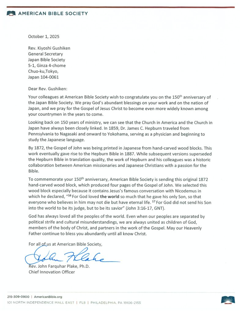 “To commemorate your 150th anniversary, American Bible Society is sending this original 1872 hand-carved wood block, which produced four pages of the Gospel of John. We selected this wood block especially because it contains Jesus's famous conversation with Nicodemus in which he declared,