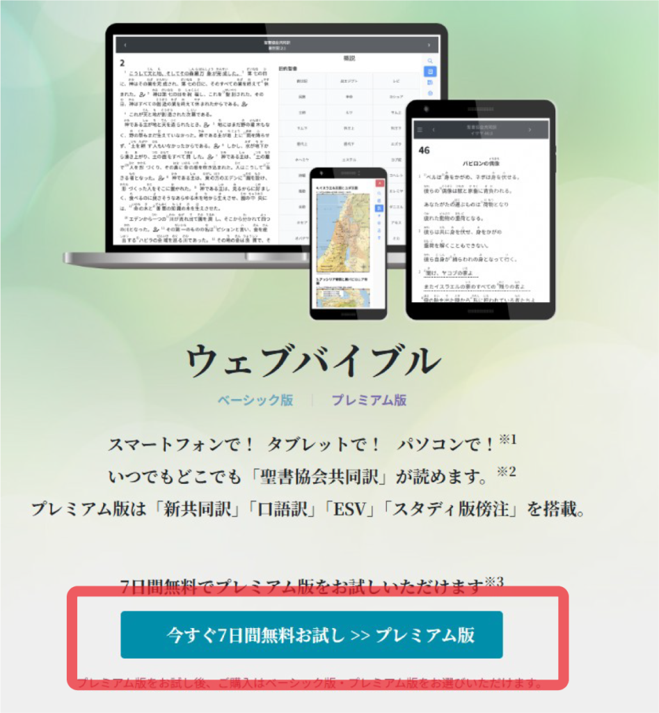 プレミアム版は「新共同訳」「口語訳」「ESV」「スタディ版傍注」を搭載。