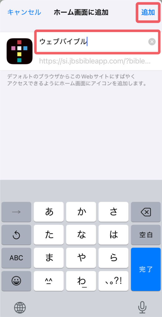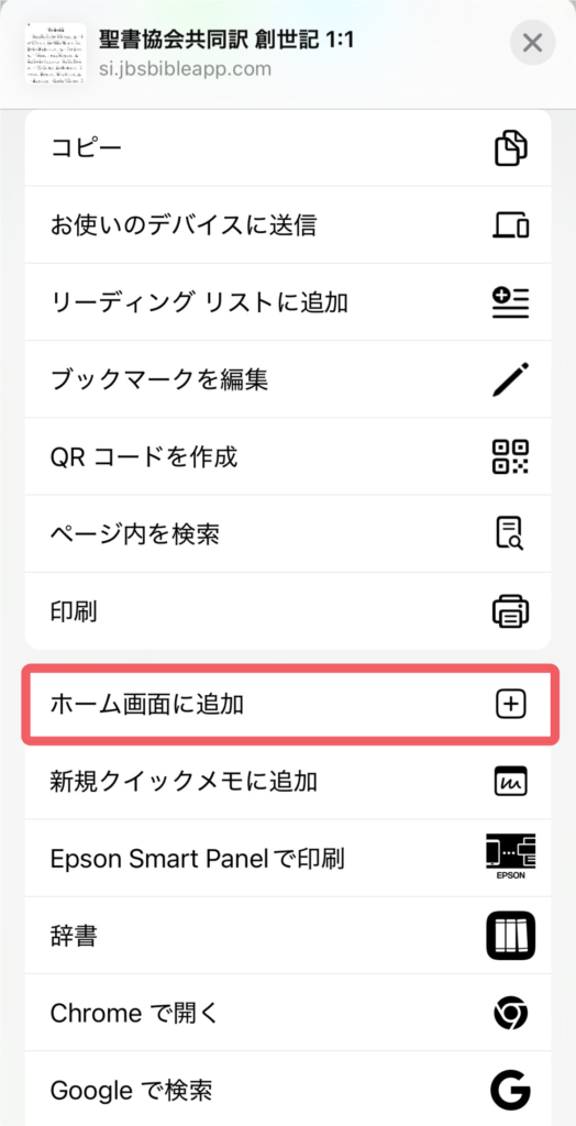 これでウェブサイトへのショートカットがホーム画面に追加され、タップするとChromeでウェブバイブルが開きます。