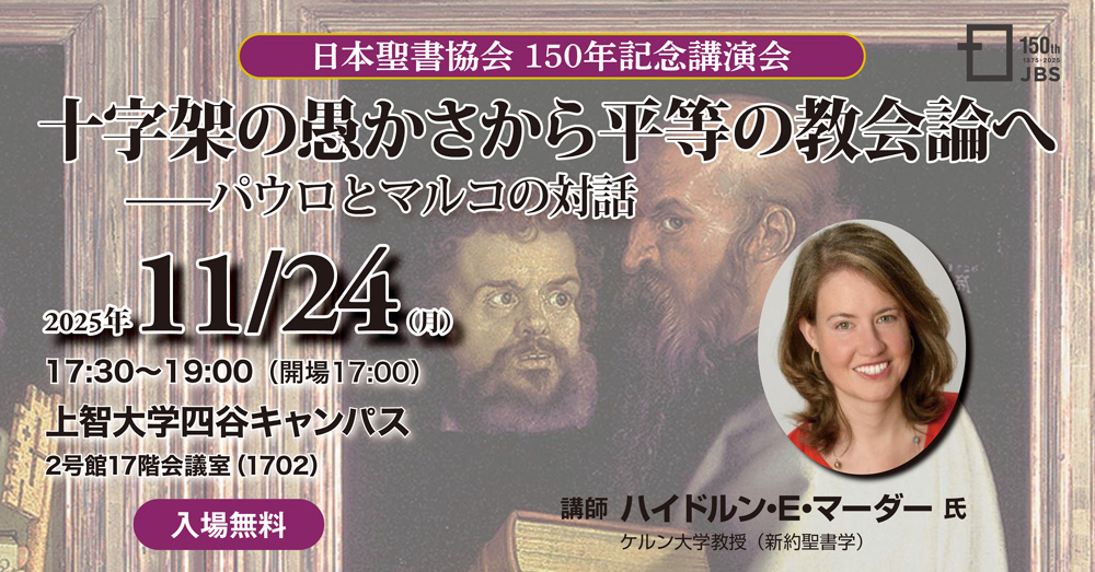 聖書をお届けする ひろく あまねく それが 私たちの仕事です 今日の聖句 150年記念講演 立教大学 場所:立教大学 2025年6月14日(土) 終了しました 150年記念 式典・レセプション 場所:東京カテドラル聖マリア大聖堂、ホテル椿山荘東京 2025年10月1日(水) 終了しました 150年記念講演 上智大学 場所:上智大学 2025年11月24日(月) 申込受付中 新着トピックス 2023年12月28日お知らせ朗読音声『オーディオ版 聖書 聖書協会共同訳』を「Amazonオーディブル」で販売開始2023年12月12日キャンペーン・イベント【1月27日開催】第2回「聖書エッセイコンテスト」授賞式&特別対談「聖書の魅力について考える」林あまり氏×清涼院流水氏2023年12月8日お知らせ11/25 聖書協会共同訳セミナー渋谷 講演1「詩文学を読み味わう」小友聡先生、講演2「詩編は心の泉」春日いづみ先生 アーカイブ配信しました。2023年11月29日お知らせ11/3 聖書協会共同訳セミナー盛岡 「明日に向かって種を蒔こう」 講師:小友 聡 先生 アーカイブ配信しました。2023年11月29日お知らせ第62回聖書和訳頌徳碑記念式典 講演「ギュツラフの聖書翻訳について」 渡部 満 氏 アーカイブ配信しました。2023年11月17日新刊・製品「ひと時の黙想 心の貧しい人とは」のご案内2023年10月25日キャンペーン・イベント【12月8日開催】聖書協会クリスマス礼拝2023年10月23日お知らせ「聖書愛読こよみ2024」ができました。2023年10月19日キャンペーン・イベント11/4 いの☆フェス2023仙台にブース出展します2023年9月28日キャンペーン・イベント10/9 伝道団体連絡協議会 秋のフェスティバルにブース出展します 過去のプレスリリースはこちら イベント一覧 今日の聖句(愛読こよみ) 11月のフォト 人生のヒントになる聖書のことば 人生のヒントになる聖書のことば おすすめ動画 【聖書のツボ】第14回 「新約聖書の時代を知る・前編」 淺野淳博氏(関西学院大学教授) 【聖書のツボ】第14回 「新約聖書の時代を知る・後編」 淺野淳博氏(関西学院大学教授) 【聖書のツボ】第13回 「旧約聖書のキーワードを学ぶ」 大島力氏(青山学院大学名誉教授、旧約学者) 日本聖書協会YOUTUBEチャンネルへ 新刊情報 聖書協会共同訳小型聖書ジッパー付き 黙想シリーズ「日々の黙想今ここに気付く150の祈りと瞑想」 聖書普及事業150年記念出版旧約聖書 詩篇 四訳対照 バイリンガルバイブル聖書を和英対照で味わう聖書協会共同訳×ESV みんなの聖書マンガシリーズ全6巻セット 聖書協会共同訳 日本語としての美しさと読みやすさを両立した新しい共同訳 わたしの聖書物語英国の著名な神学者N・T・ライトが贈る今までにない聖書物語 聖書協会共同訳講壇用聖書堂々完成 ご支援のお願い 聖書普及のためにご支援ください 後援会へご入会ください ライフメモリアル献金のお勧め 日本聖書協会公式 X Tweets by JBSbible 日本聖書協会公式 Facebook 日本聖書協会 FacebookX
